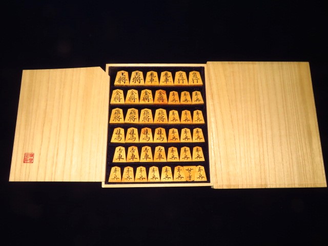東泉作新魚龍薩摩黄楊縮杢彫源平将棋駒/新品 桐平箱付(KS1267)