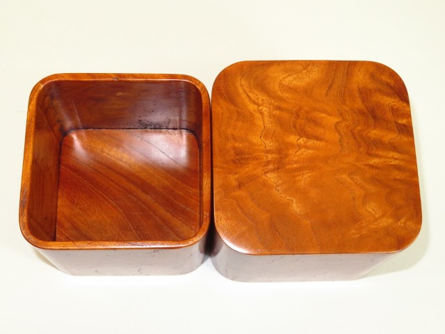 蓋の天板は(単なる接着ではなく)はめ込み式(駒箱によく有り勝ちな蓋の天面と側面の微妙なズレが生じません)、もちろん蓋の下部、内箱の上部にトメ(チギリ)が埋めてあります。非常に完成度の高い作品です。