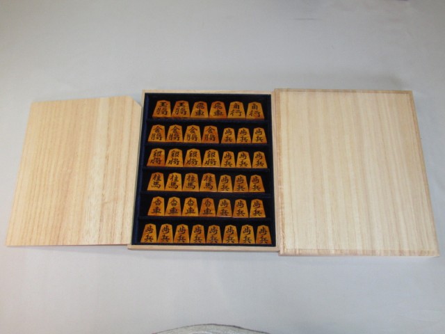 「四天王駒」。升田名人直筆揮毫桐二重箱、宮松盤駒店にて販売されていた島桑駒箱が付属いたします。