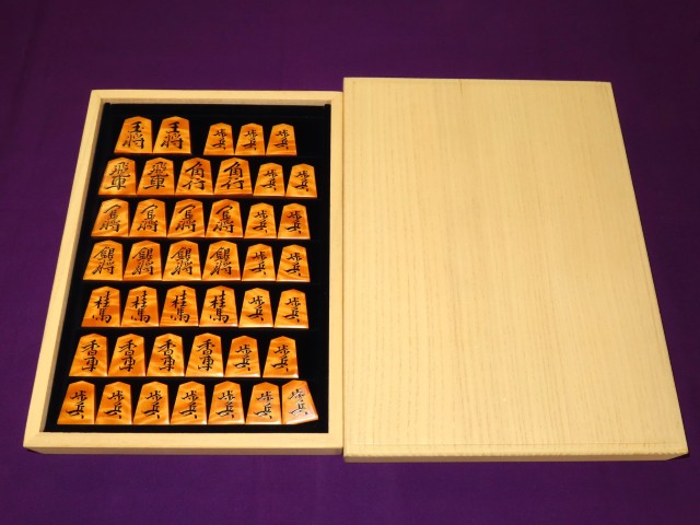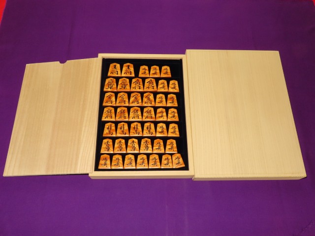 児玉龍兒作長禄御蔵島黄楊銀目杢盛上将棋駒/傾斜七段高級桐平箱 未使用品(K927)