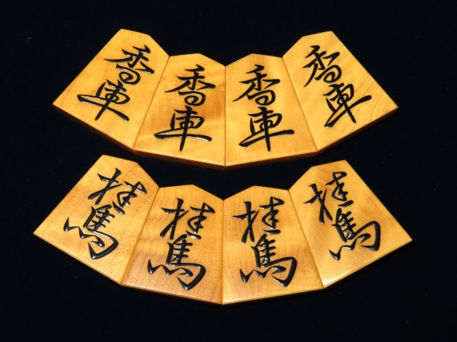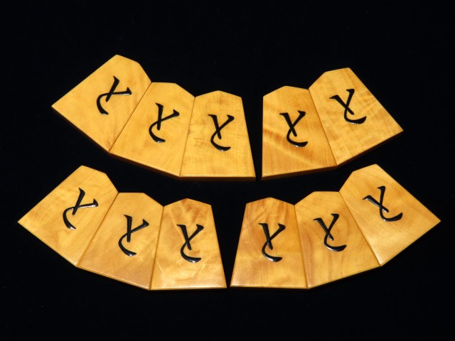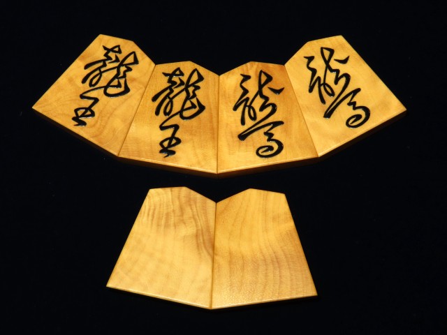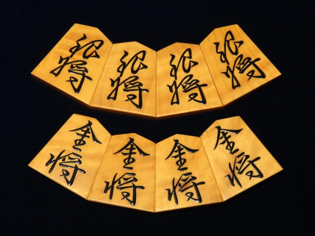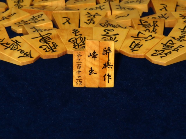 増山酔棋作峰(みね/作品番号312作)・・・。師の作品には華があります、雅で美しく不思議な艶があります。師の作品には特殊な方法による「漆書駒」もございますが本作は(彫・埋め・盛上工程を経た)盛上駒です。