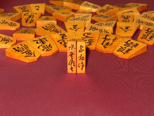 宮松影水作水無瀬御蔵島黄楊杢盛上将棋駒/使用品桐平箱(K947)