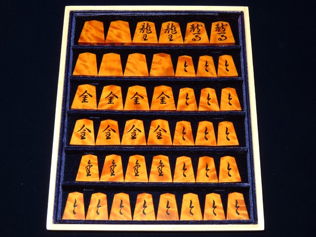 宮松影水作錦旗御蔵島黄楊虎杢盛上将棋駒/使用品桐平箱(K952)