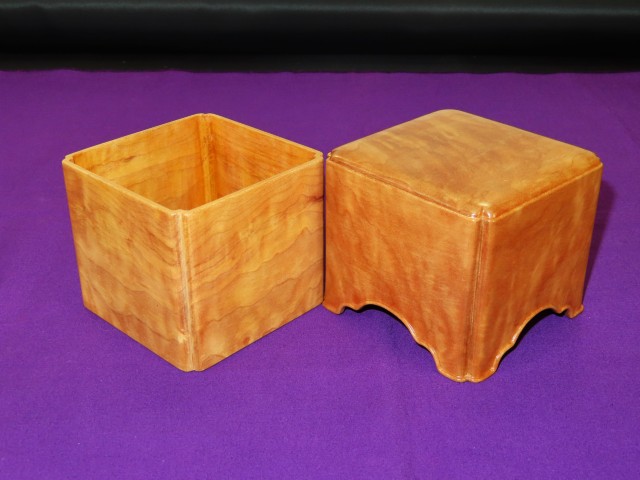まず、隅丸隅入造り。駒箱の隅をまず、丸く成形して更に隅入(中心部が中に食い込む形状)にします。この細工ができる指物師は師を置いて他におりません。