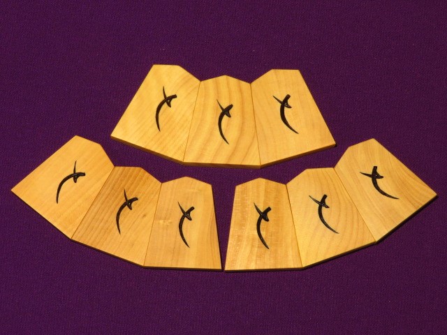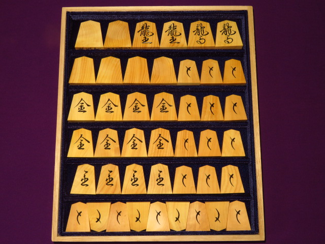 東泉作新魚龍御蔵島黄楊柾目彫埋将棋駒(木地呂漆使用)/新品 桐平箱付(KS1096)
