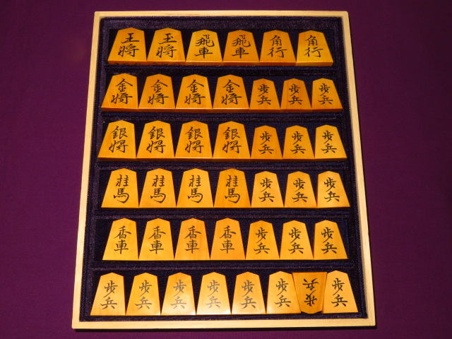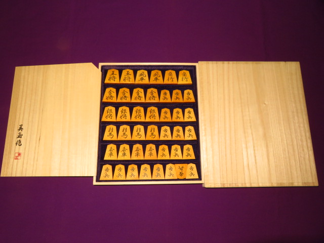 美玉作鵞堂御蔵島黄楊古木斑入上柾目彫埋将棋駒 新品/桐平箱付(KS1188)