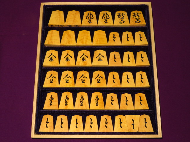 書体は「錦旗(きんき)」、後水尾天皇の銘と伝えられる伝統の書体。「(駒の道は)錦旗に始まり錦旗に終わる」といわれるオーソドックス、それでいて奥の深い書体です。
