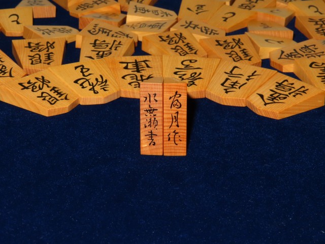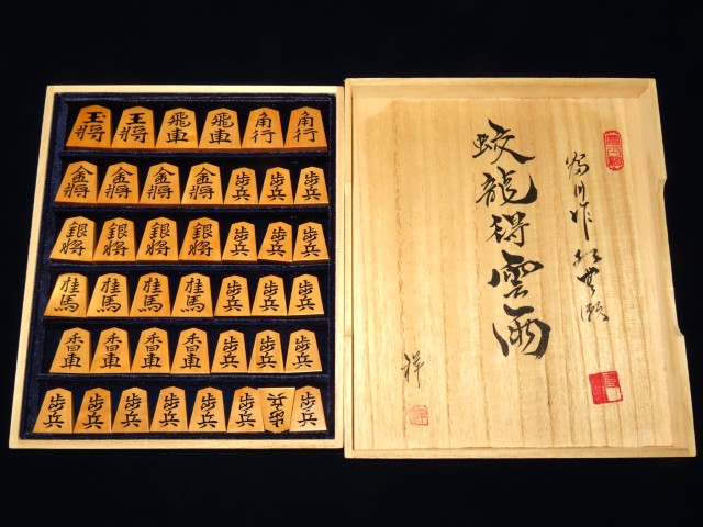 富月作水無瀬島黄楊赤柾盛上将棋駒 揮毫桐製平箱付 未使用品(KS1347)
