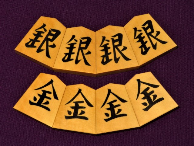 書体はNHKタイプ一文字。テレビのNHK杯戦でおなじみの書体です。金と成り銀の区別が見やすく一文字書体にあっては美しさ、使いやすさ共にバツグンです。