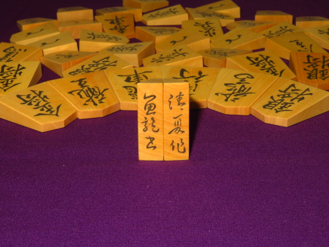 清夏作魚龍島黄楊斑入柾目彫埋将棋駒/新品 桐平箱付(KS597)