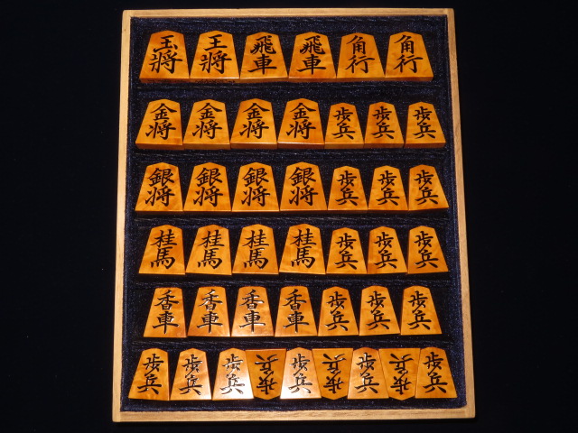 江陽作巻菱湖島黄楊赤根杢盛上将棋駒/桐製平箱付 使用品(KS618)