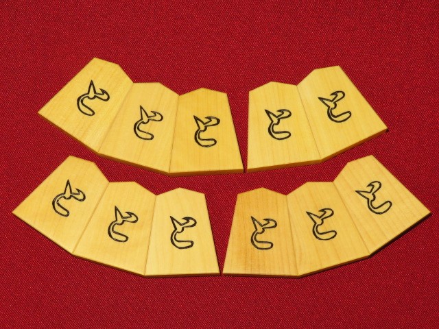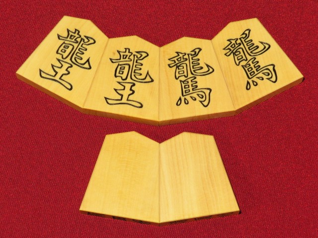 書体は坂田三吉王将が好んだと伝えられる「坂田好(さかたこのみ)」。表字が篆書、裏字が楷書の筋彫り仕上げ、坂田に「馬」の字を教えた中村眉山の銘と伝えられています。非常に珍しい書体です。一般の書体に比して倍ほどにも手間がかかるといわれる駒師泣かせの書体です。