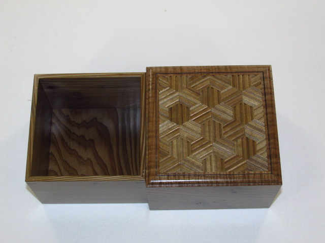 材は神代杉、木画(毘沙門柄)をあしらったものすごい完成度の高い作品です。天板ははめ込み式で天板と側盤のズレが生じません。長く愛せる作品です。裏面には師の落款がはいります。