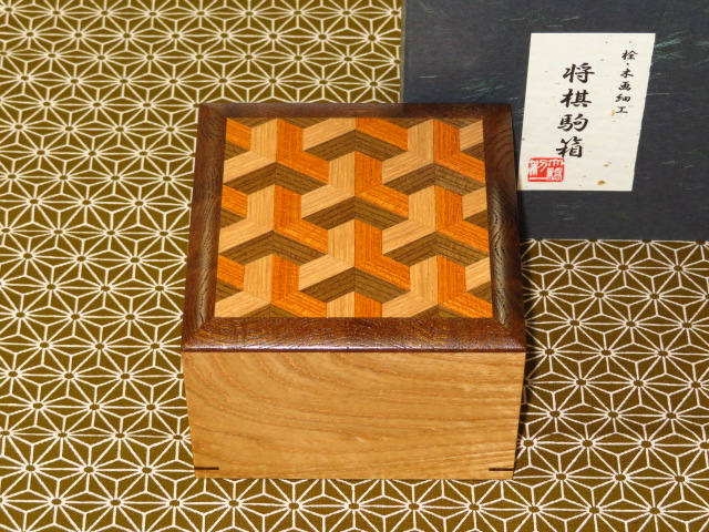 超高級美術組子の第一人者、二代目大橋利一(りいち/1953〜)の作品、銘入栓(せん)装飾木画駒箱です。