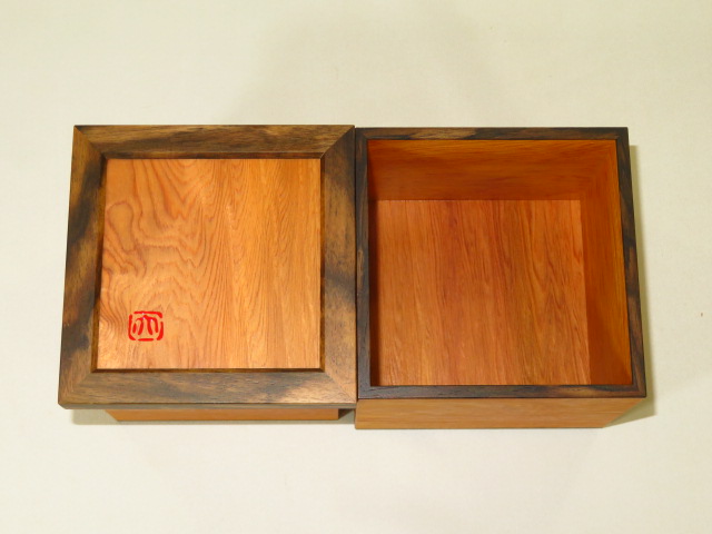 材は屋久杉、組子による装飾をあしらったものすごい完成度の高い作品です。天板ははめ込み式で天板と側盤のズレが生じません。長く愛せる作品です。裏面には師の落款がはいります。
