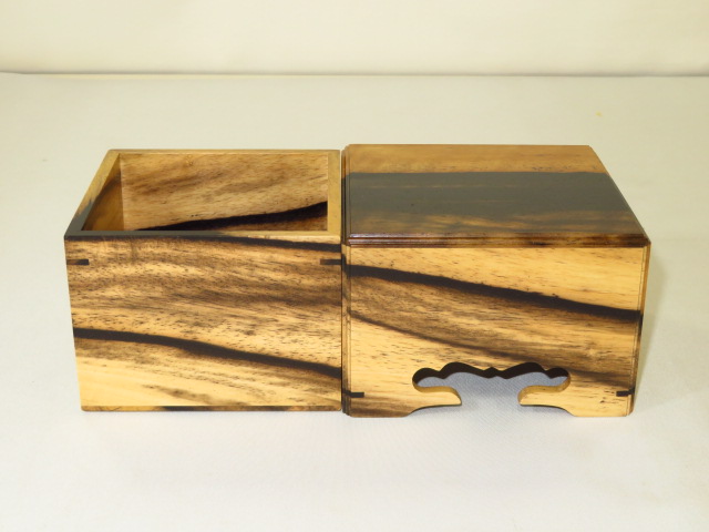 高橋徹男(高橋工芸)。九州宮崎の上手です。美術駒箱・駒台等得意としています。素材は駒箱材の最高峰、黒柿虎斑。新品です。