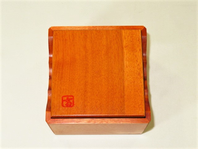 高橋徹男(高橋工芸)。九州宮崎の上手です。美術駒箱・駒台等得意としています。素材は水目桜。新品です。