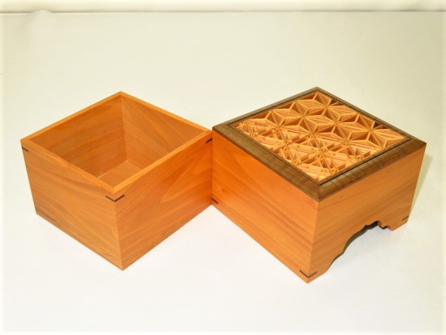 材は本桂(ほんかつら)、師の創作組子をあしらったものすごい完成度の高い作品です。天板ははめ込み式で天板と側盤のズレが生じません。長く愛せる作品です。裏面には師の落款がはいります。