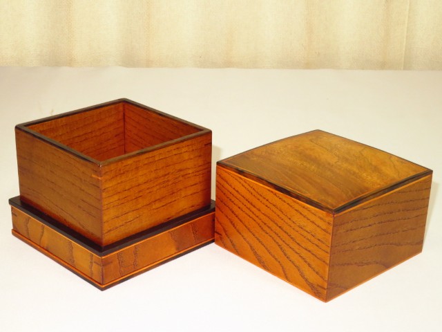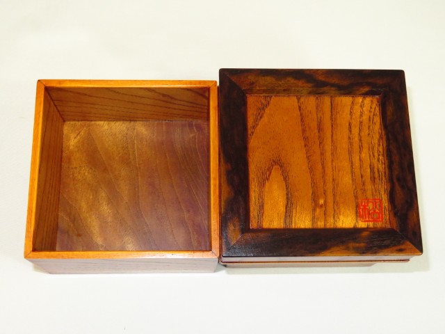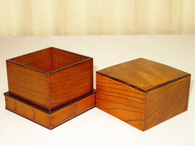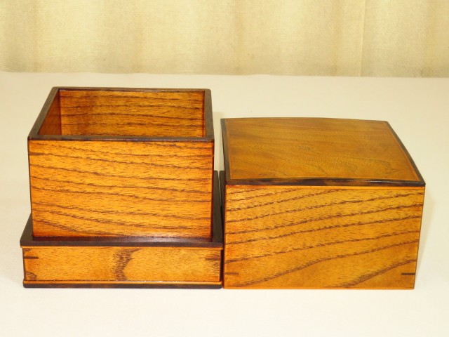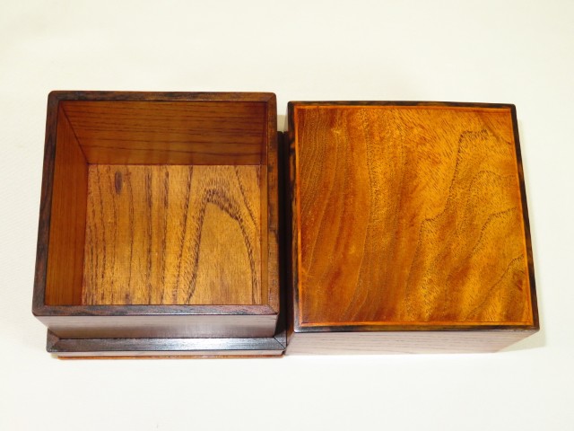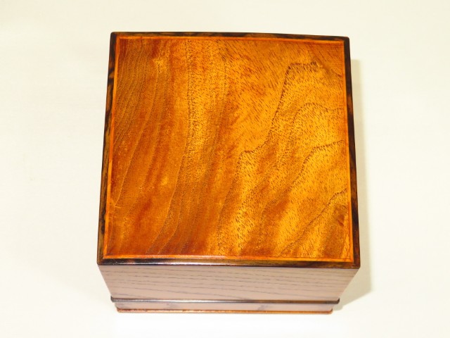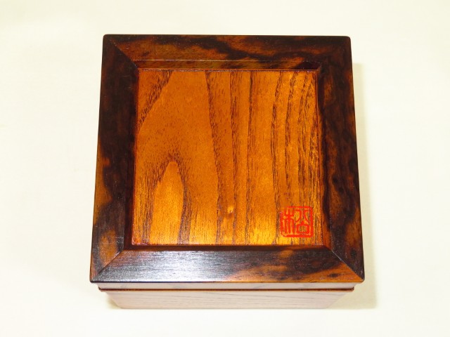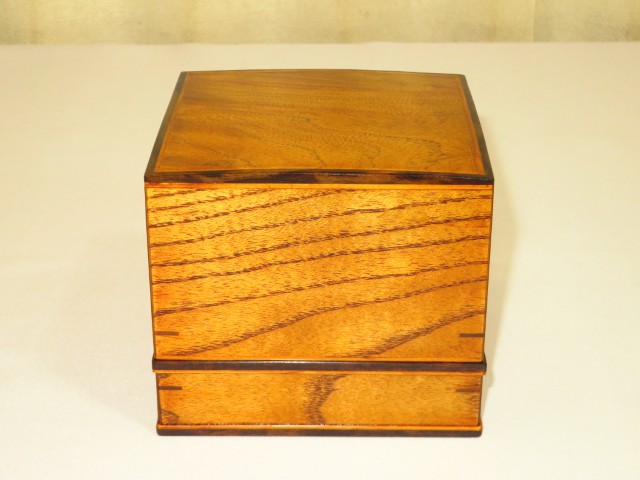 四隅落印籠形、黒檀と黄楊の回り縁・丹念な拭き漆・蓋の天板は(単なる接着ではなく)はめ込み式(駒箱によく有り勝ちな蓋の天面と側面の微妙なズレが生じません)・上下の木目の文様をあわせる等、もうこれ以上は考えられない作品。もちろん蓋の下部・内箱の上部にトメ(チギリ)が埋めてあります。
