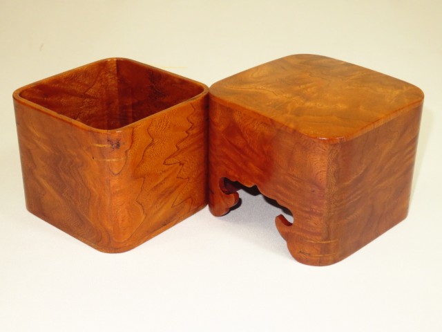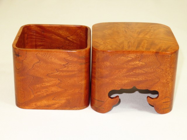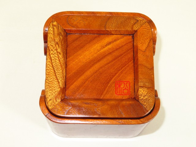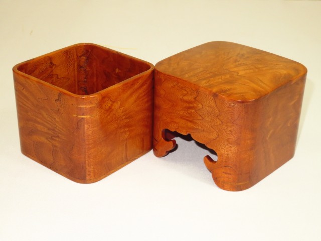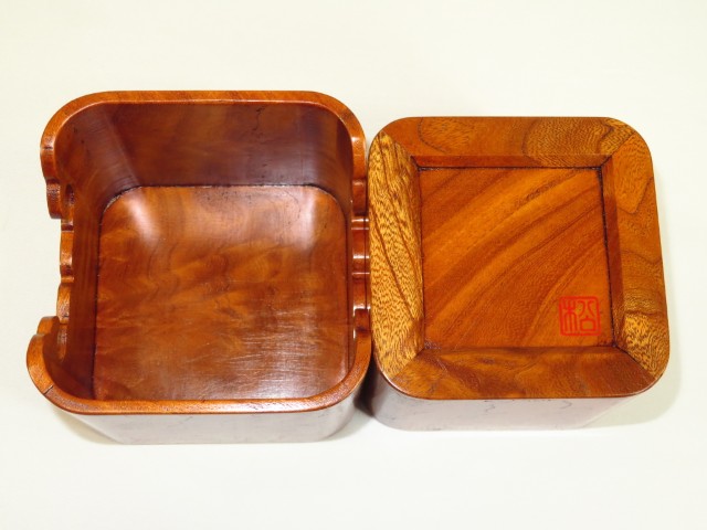 蓋の天板は(単なる接着ではなく)はめ込み式(駒箱によく有り勝ちな蓋の天面と側面の微妙なズレが生じません)、もちろん蓋の下部、内箱の上部にトメ(チギリ)が埋めてあります。非常に完成度の高い作品です。