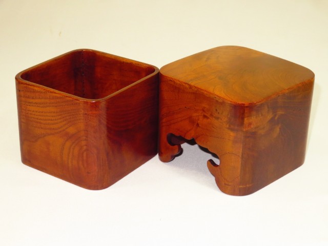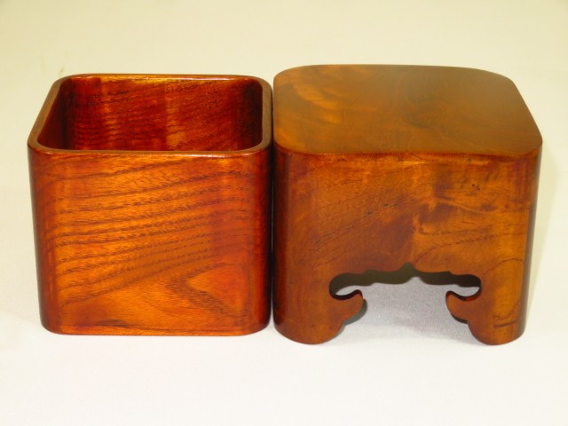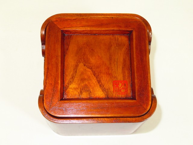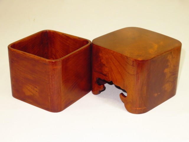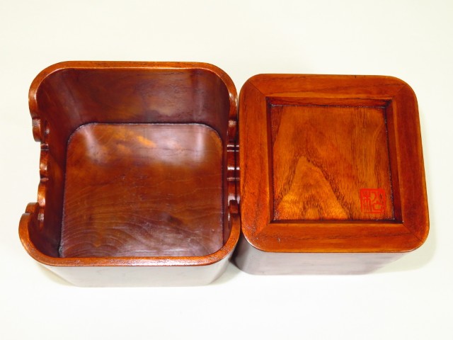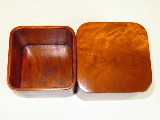 蓋の天板は(単なる接着ではなく)はめ込み式(駒箱によく有り勝ちな蓋の天面と側面の微妙なズレが生じません)、もちろん蓋の下部、内箱の上部にチギリが埋めてあります。