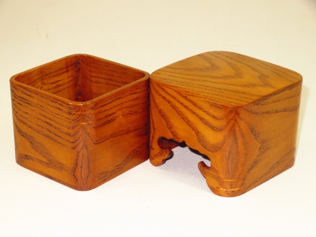 蓋の天板は(単なる接着ではなく)はめ込み式(駒箱によく有り勝ちな蓋の天面と側面の微妙なズレが生じません)、もちろん蓋の下部、内箱の上部にチギリが埋めてあります。