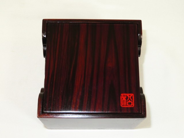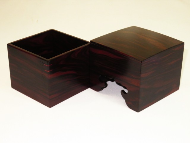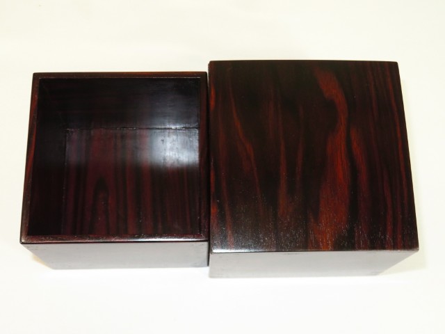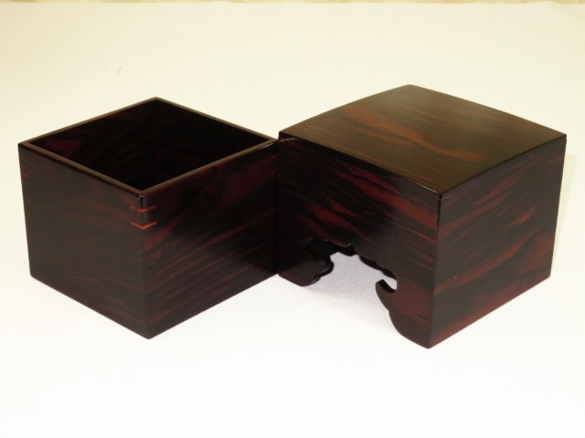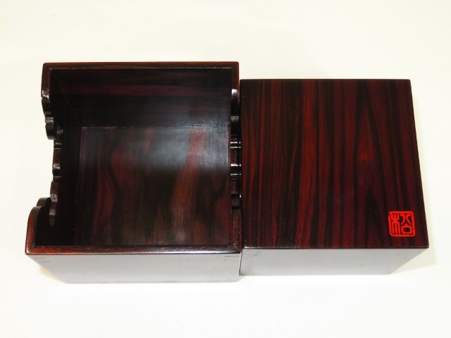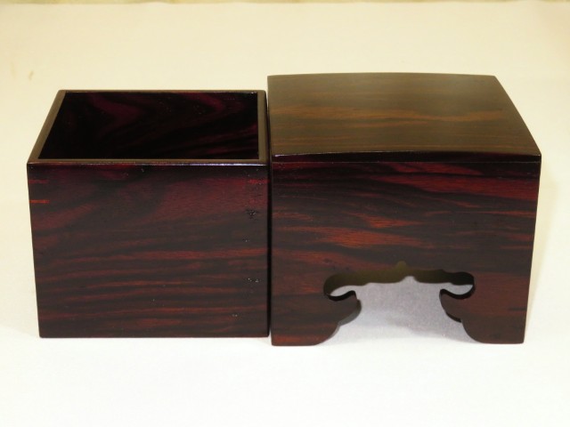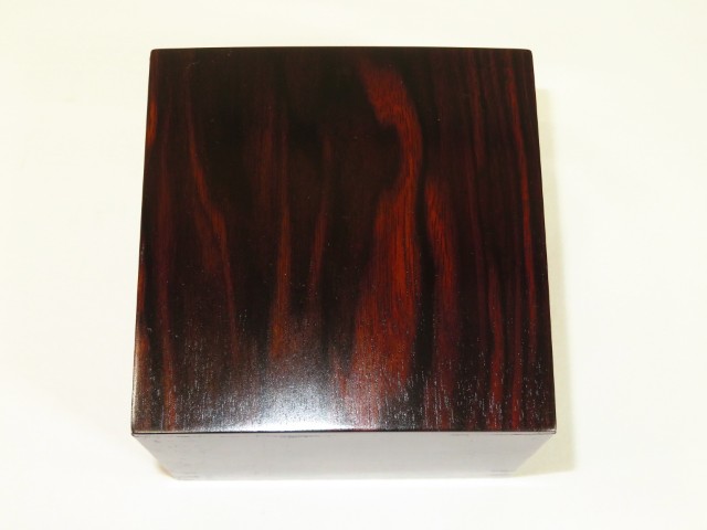蓋の天板は(単なる接着ではなく)はめ込み式(駒箱によく有り勝ちな蓋の天面と側面の微妙なズレが生じません)、もちろん蓋の下部、内箱の上部にトメ(チギリ)が埋めてあります。
