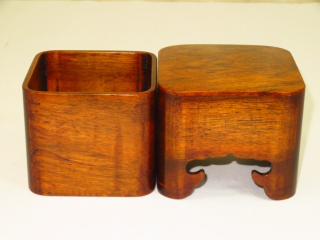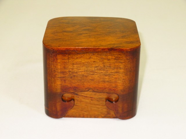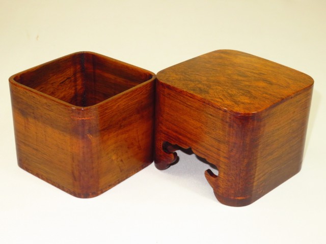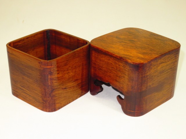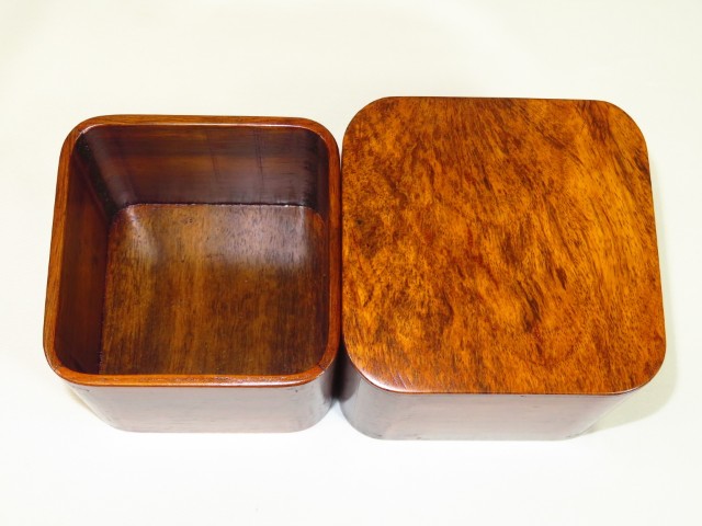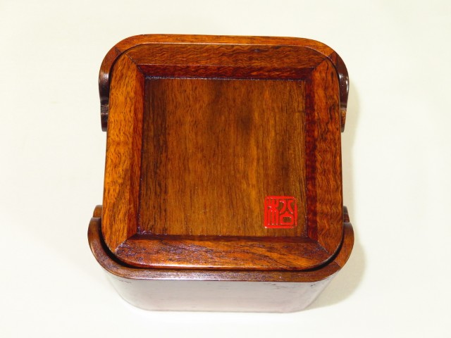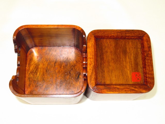 蓋の天板は(単なる接着ではなく)はめ込み式(駒箱によく有り勝ちな蓋の天面と側面の微妙なズレが生じません)、もちろん蓋の下部、内箱の上部にチギリが埋めてあります。
