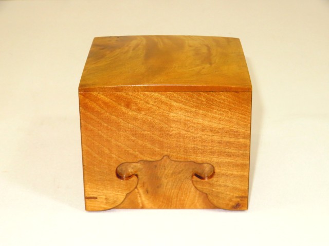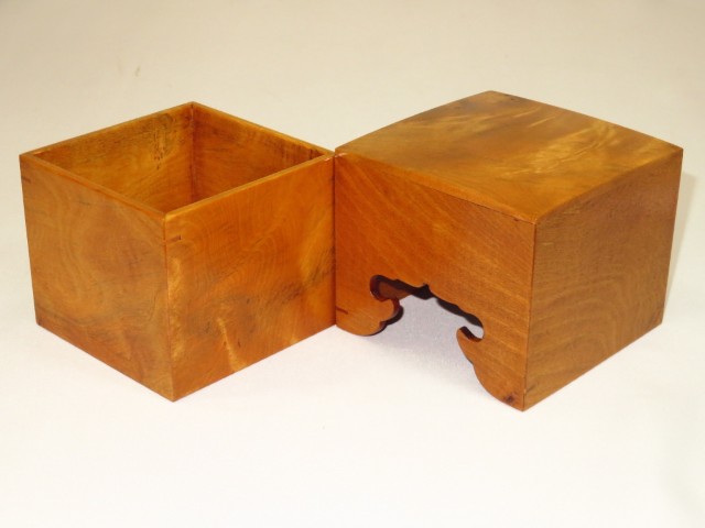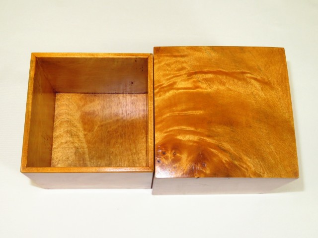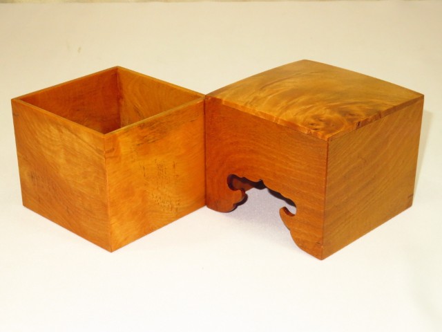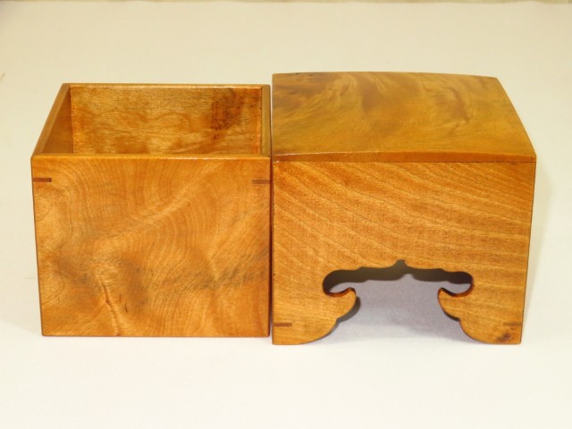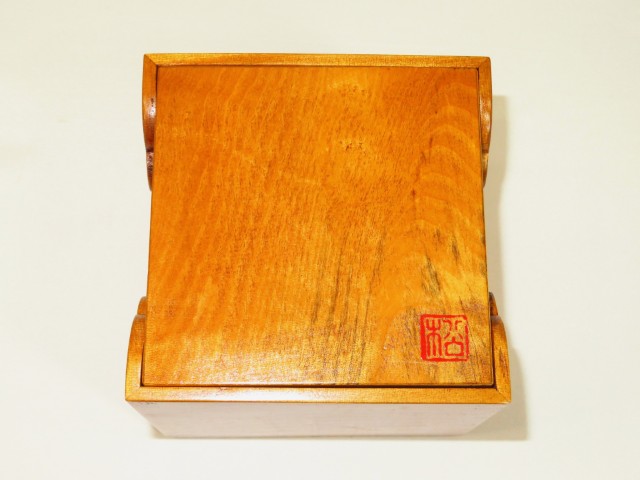 蓋の天板は(単なる接着ではなく)はめ込み式(駒箱によく有り勝ちな蓋の天面と側面の微妙なズレが生じません)、もちろん蓋の下部、内箱の上部にトメ(チギリ)が埋めてあります。