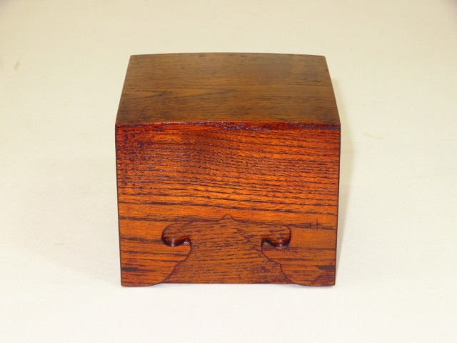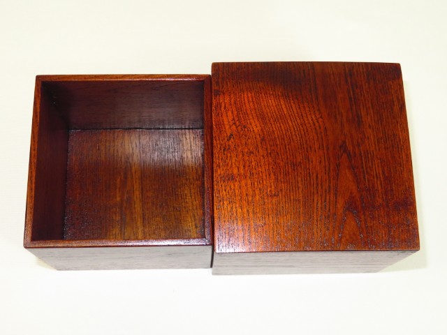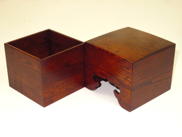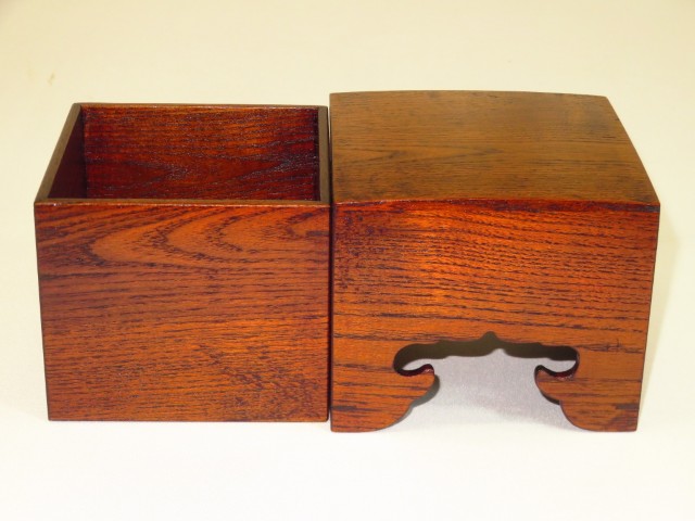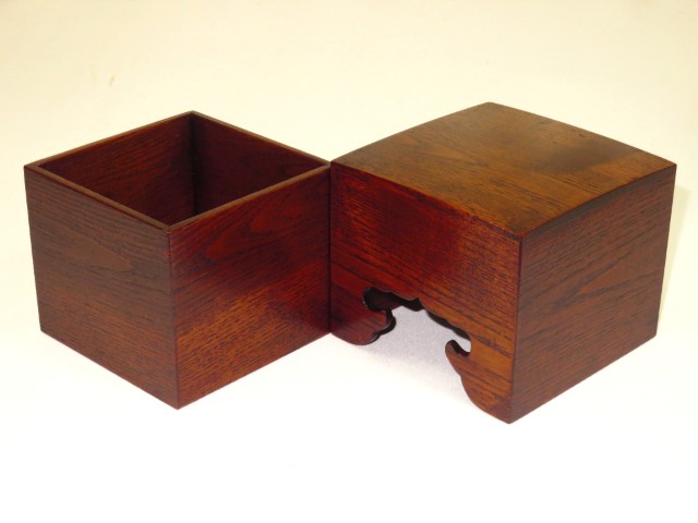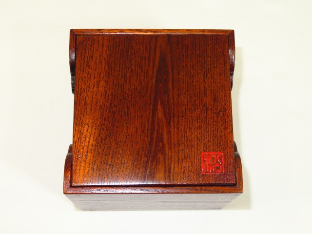 蓋の天板は(単なる接着ではなく)はめ込み式(駒箱によく有り勝ちな蓋の天面と側面の微妙なズレが生じません)、もちろん蓋の下部、内箱の上部にトメ(チギリ)が埋めてあります。