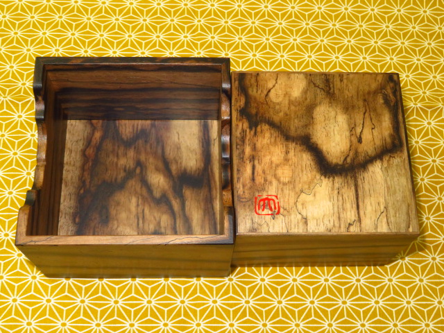 チギリの細工、木目合わせの精度の高さ等完成度が違います。蓋の天板は(単なる接着ではなく)はめ込み式(駒箱によく有り勝ちな蓋の天面と側面の微妙なズレが生じません)、手を離して蓋が閉まるまで約5秒ほどでした。