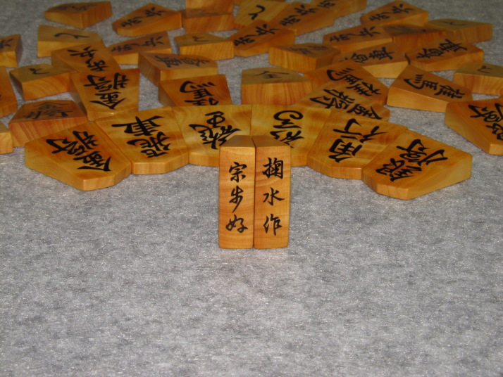 書体は人気の「宗歩好(そうほこのみ)」、棋聖天野宗歩が好んだと伝えられる書体です。毎年名人戦第一局に限り使用される名駒、名人駒(将棋連盟所蔵、奥野一香作)がこの「宗歩好」です。本作は名人駒に倣って双玉仕立て。