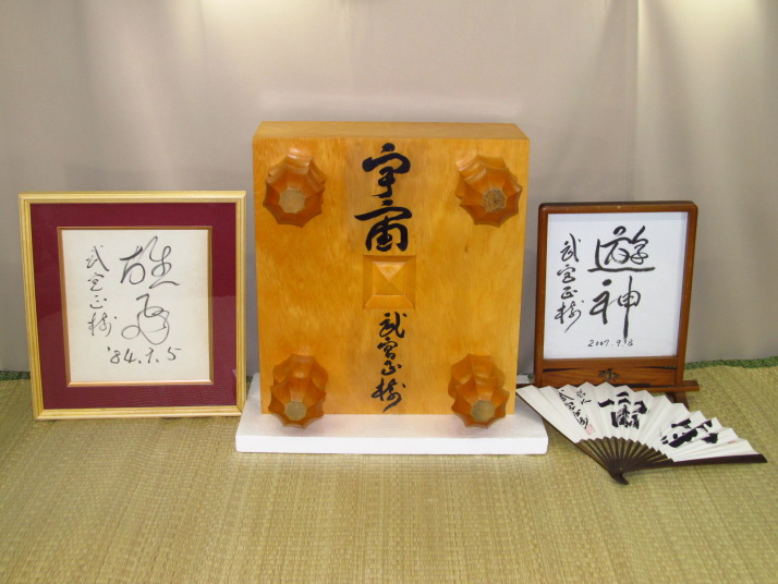 中国産榧。直筆扇子「宇宙」、直筆色紙「遊神」、同「雄飛」付
