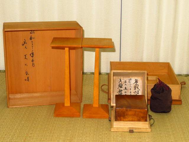 第十三期名人戦使用/影水作菱湖島黄楊赤柾盛上駒、駒台駒箱等付属品一式(K746)