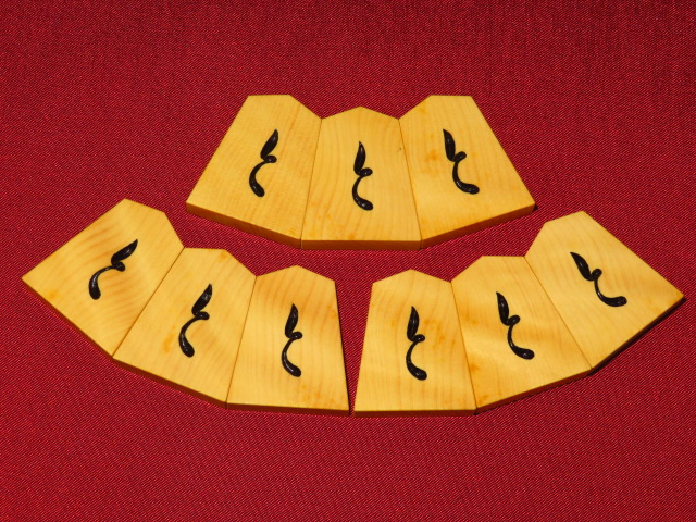 書体は「錦旗(きんき)」、後水尾天皇の銘と伝えられる伝統の書体。「(駒の道は)錦旗に始まり錦旗に終わる」といわれるオーソドックス、それでいて奥の深い書体です。