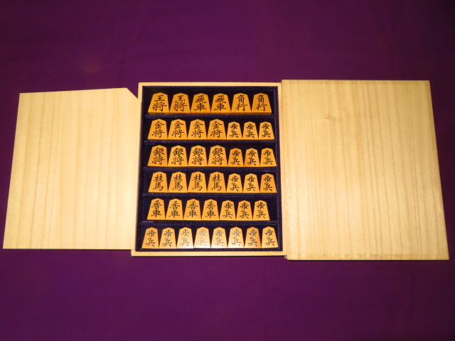 金井静山作菱湖御蔵島黄楊斑入糸柾盛上将棋駒/未使用品桐平箱(K833)
