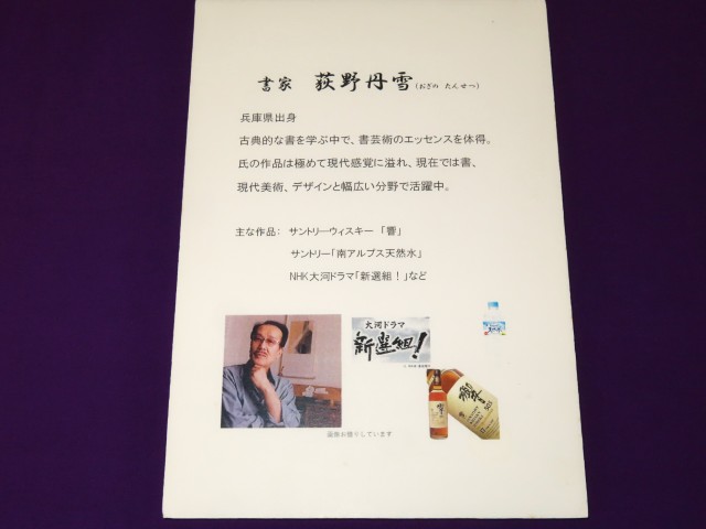 荻野丹雪(おぎの・たんせつ/1939〜)。書家でありながら、書の枠を超え現代美術・デザインと幅広い分野で活躍中。作品はサントリーウイスキー「響」、NHK大河ドラマ「新選組!」等のラベルやタイトルに採用されています。
