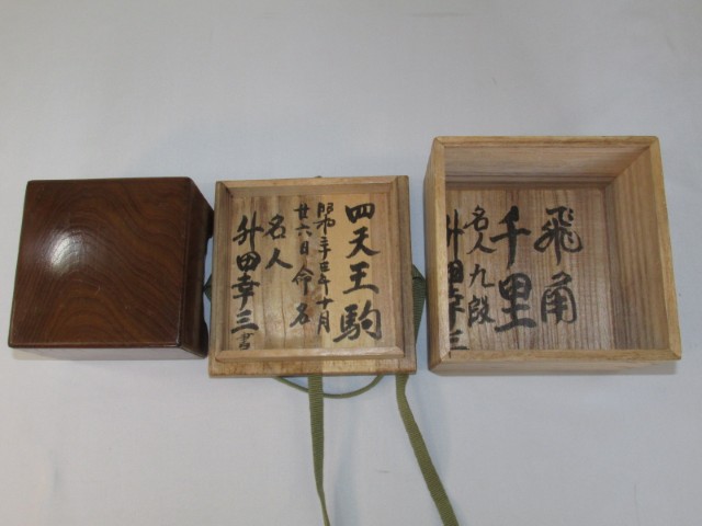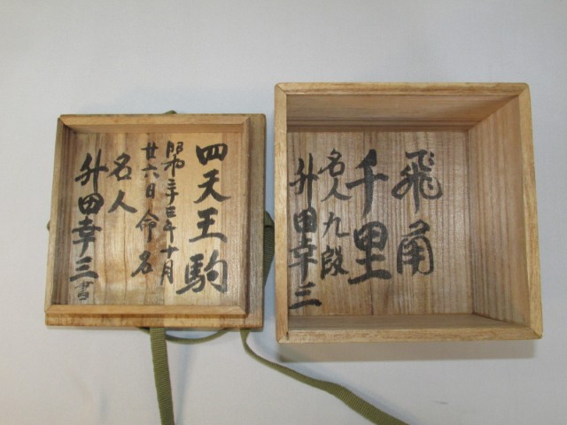 「四天王駒」。升田名人直筆揮毫桐二重箱、宮松盤駒店にて販売されていた島桑駒箱が付属いたします。