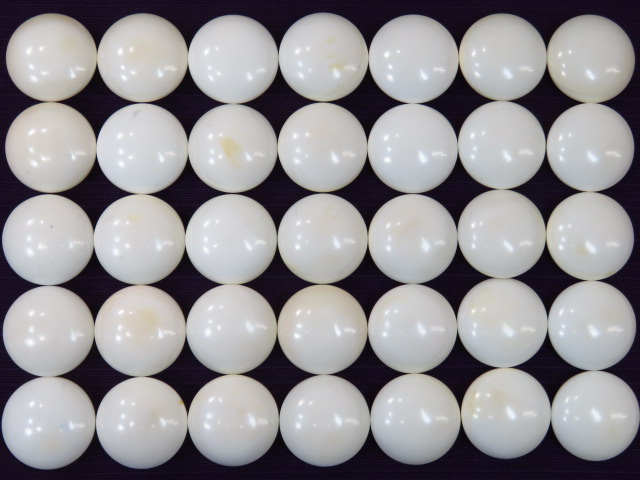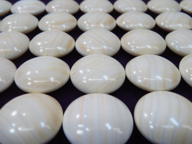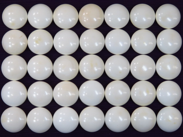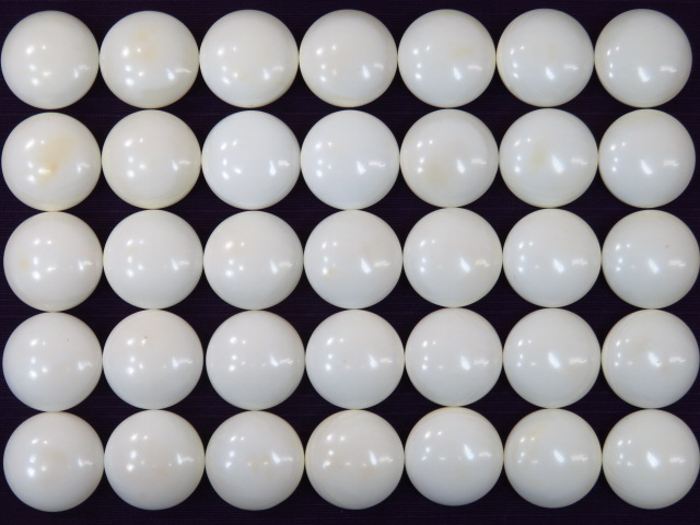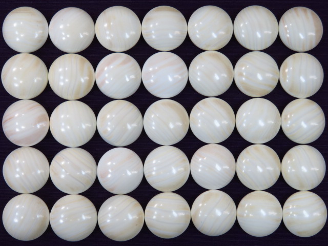 厚さはランダムに数個確認いたしました所、いずれも充足いたしておりました。目立ったワレ・大きなホツはザッと目視した限りではないようでしたが極小さなワレ・ホツのある石は存する可能性がございます。又メキシコ産の混入はないと思いますが専門家の精査は経ておりません。経年によるキバミが認められました。全ての白石の表裏をUPいたしました。是非ご覧いただきご確認をお願い致します。