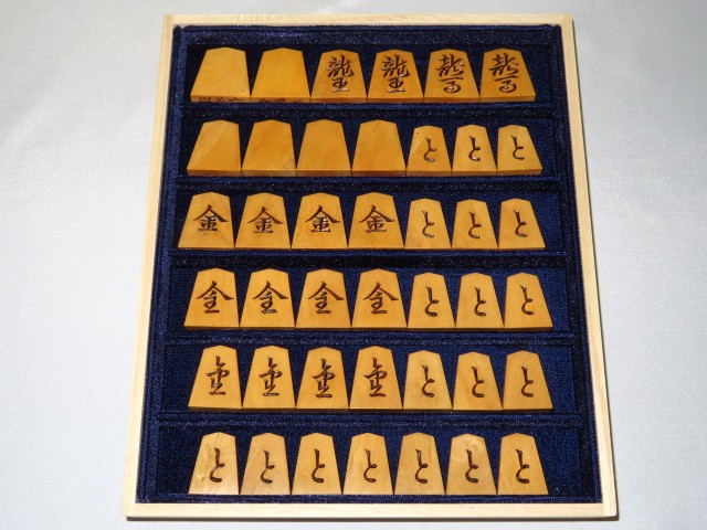 宮松影水作金龍島黄楊根杢彫将棋駒/桐平箱 使用品(K940)