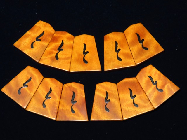 書体は「錦旗(きんき)」、後水尾天皇の銘と伝えられる伝統の書体。「(駒の道は)錦旗に始まり錦旗に終わる」といわれるオーソドックス、それでいて奥の深い書体です。