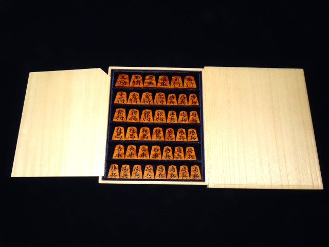 宮松影水作錦旗御蔵島黄楊虎杢盛上将棋駒/使用品桐平箱(K952)