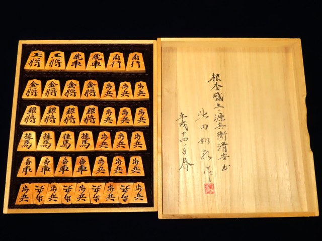 森田コレクション/北田如水作源兵衛清安島黄楊根杢盛上将棋駒/未使用品 直筆署名桐製平箱付(K954)